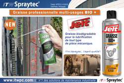 Développée par ITW Spraytec sous la marque JELT, GRAISSE BIO+ est une nouvelle graisse professionnelle multi-usages biodégradable conçue spécifiquement pour les opérations de maintenance industrielle et la lubrification de tout organe mécanique fortement sollicité (axes, câbles, roulements, paliers, glissières, galets, chaînes, engrenages, ...).