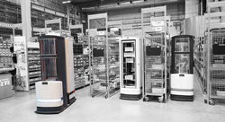 Aujourd’hui, de plus en plus d’étapes de travail liées au stockage d’articles dans les entrepôts, ainsi qu’à leur prélèvement et à leur préparation pour l’envoi sont prises en charge par des transstockeurs automatiques, des systèmes de transport sans conducteur et des robots logistiques intelligents. Les machines contrôlées par ordinateur reçoivent un ordre de travail et se déplacent automatiquement vers le rayonnage cible afin d’y déposer ou d’y récupérer un article. Pour cela, elles sont équipées, en fonction du type de système de rayonnage, de colonnes de levage, de bras télescopiques ou de préhenseurs qui saisissent et déplacent les paquets ou les plateaux.