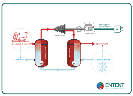 « Les acteurs industriels transforment la chaleur en électricité sur des températures supérieures à 150°C, mais avec de très grosses pertes dûes aux rejets thermiques à des températures en dessous de 100°C. Ces rejets sont définitivement perdus. C’est sur cette faille que nous intervenons » indique Mathias Fonlupt, Président d’ENTENT, à gauche sur la photo.