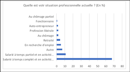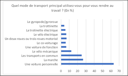 65% des répondants désirent passer à la mobilité douce pour se rendre au travail. Parmi ces répondants 72 % vivent dans des villes de plus de 100 000 habitants. Ils ont pour 71 % un temps de trajet inferieur à 30 minutes et habitent pour 80% d’entre eux à moins de 15 km de leur travail. 63% d’entre eux utilisent leur propre voiture, 37 % empruntent les transports en commun et 30,5% la marche, 14 % utilisent un vélo mécanique et 7 % un vélo électrique.