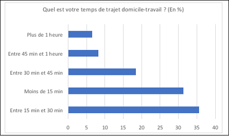 Pour la majorité des répondants, soit 35,5% le temps de trajet domicile-travail est compris entre 15 et 30 minutes. Pour 31% moins de 15 minutes. Entre 30 et 45 minutes pour 18%. Entre 45 minutes et 1 heure pour 8%. Et enfin plus d’une heure pour 6,5%.