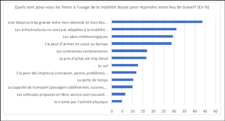 Parmi eux, le frein le plus important, pour 43,5 %, est la trop grande distance entre le domicile et le travail. Les infrastructures considérées comme non-adaptées sont en deuxième place pour 31 %. Juste derrière, avec 29,5%, ce sont les aléas météorologiques. Pour 28,5%, la peur de ne pas arriver présentable au bureau les empêche de prioriser le vélo pour se rendre au travail. Aussi, les contraintes vestimentaires ne permettent pas de se rendre au travail à vélo pour 17%. Le prix d’achat d’un vélo est trop important pour 16,5%, tandis que pour 12,5% la peur de se faire voler son vélo est un facteur important dans cette décision de ne pas prioriser ce mode de déplacement.