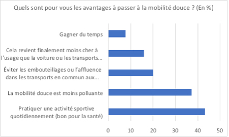 Le souhait de passer à la mobilité douce s’explique pour les raisons suivantes : pour 43%, la volonté de pratiquer une activité sportive, mais ils y voient également, une démarche éco citoyenne pour 37%. Un côté pratique, pour 20% d’entre eux, car le vélo permettrait d’éviter les embouteillages ou l’affluence dans les transports en commun. Des économies pour 16%, car le vélo ou les transports en commun leur reviendraient moins cher que l’usage de la voiture. Et enfin, un gain de temps pour 7,5% de nos répondants.