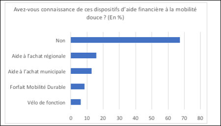67%, soit la majorité d’entre eux, n’ont pas connaissance des dispositifs d’aide financière à la mobilité. Pour le reste des répondants, 15,5% a connaissance de l’aide à l’achat régionale, 12,5% l’aide à l’achat municipale, 8% le forfait à la mobilité durable, 6% le vélo de fonction.