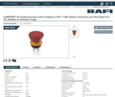 Pour chaque produit, un menu propose, à côté des données techniques et d’une zone de téléchargement, une description détaillée du produit, avec notamment des images et des vidéos. Une fonction de visualisation 3D permet aussi d’étudier le produit sous tous les angles. La zone de téléchargement fournit les données 3D du produit sélectionné au format STP pour importation dans les systèmes CAO. Les utilisateurs peuvent également trouver à cet emplacement les déclarations de conformité ainsi que les manuels d’utilisation, les certificats et les brochures de produits. Une liste de souhaits permet d’envoyer des demandes de renseignements sur les produits et de recevoir des réponses des distributeurs RAFI. Le nouveau catalogue électronique de RAFI est disponible en français et a été conçu pour un affichage optimal sur ordinateur, tablette et smartphone.