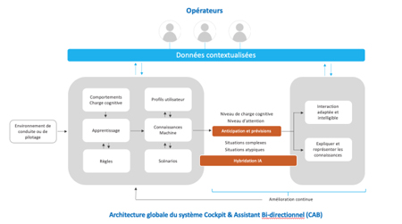 « Ce projet vise à concevoir des systèmes hybrides impliquant l’utilisation de techniques d’intelligence artificielle (représentation de connaissances, machine learning, aide à la décision) et d’Interfaces Homme-Machine multimodales bidirectionnelles (coopération homme machine, IHMs personnalisées, IHMs adaptatives, data visualisation), tout en tenant compte des facteurs humains (charge cognitive, modes de contrôle, modèle humain). Les assistants virtuels bidirectionnels ont vocation à rendre les opérateurs encore plus performants. En apprenant d’eux et en anticipant sur les actions à venir, ils s’inscrivent dans le sens d’une véritable coopération au service de l’efficacité opérationnelle », explique Walid Achour, chef de projet CAB.
