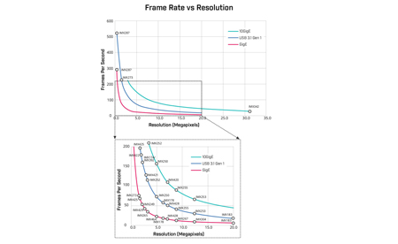 Ces interfaces permettent aux caméras de vision artificielle de se connecter à des systèmes hôtes en utilisant les protocoles USB et Ethernet les plus courants. Pour la plupart des applications de vision artificielle, les interfaces grand public USB 3.1 Gen 1 et Gigabit Ethernet offrent un mélange réussi de commodité, de vitesse, de simplicité et de prix. En outre, les interfaces grand public prennent en charge le matériel et les périphériques les plus courants pour mettre en œuvre la vision artificielle. Les concentrateurs, commutateurs, câbles et cartes d’interface USB et Ethernet peuvent être achetés partout et à différents prix, depuis Amazon jusqu’à votre magasin local de matériel électronique ou informatique, pour répondre exactement à vos besoins. La plupart des PC, ordinateurs portables et systèmes intégrés comportent au moins un port Gigabit Ethernet et un port USB 3.1 Gen 1. Ces catégories d’interfaces se distinguent surtout par leur largeur de bande. Des interfaces plus rapides permettent des fréquences d’images plus élevées (Fig. 1) pour une résolution donnée. Une interface plus rapide vous permet de capturer plus d’images par seconde ou de capturer des images de plus haute résolution sans devoir réduire le débit.