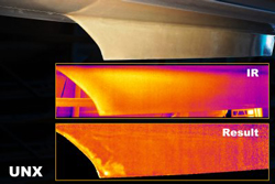 Spécificité : le défaut peut être localisé rapidement et précisément. En effet, en plus de l’image thermique à infrarouge permettant de déterminer la répartition générale de la température sur la surface de test, le système UNX reçoit en parallèle des informations visuelles de la caméra-industrielle intégrée et définit ainsi l’état exact du défaut du matériau. La combinaison de la caméra infrarouge avec la caméra sur carte avec autofocus d’IDS, associée à un ordinateur industriel intégré doté d’un écran tactile de 7 pouces ainsi qu’aux logiciels correspondants, est déterminante. L’instrument breveté à Taiwan est mobile et ne nécessite aucun autre ordinateur externe.
