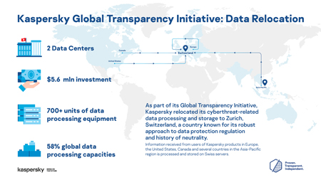 Dans le cadre de son Initiative Globale de Transparence, Kaspersky avait annoncé procéder au transfert de ses activités de traitement et de stockage de données de la Russie vers la Suisse. Deux ans après cette annonce, la relocalisation est désormais achevée, avec deux datacenters ouverts à Zurich. Ces datacenters rassemblent les données émises par les utilisateurs des solutions Kaspersky en Europe, aux Etats-Unis, au Canada, et dans plusieurs pays d’Asie-Pacifique. Les données sont transmises au réseau Kaspersky Security Network (KSN), qui effectue une analyse automatisée des malwares détectés.