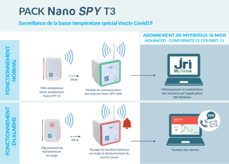 Pour répondre à ces obligations, JRI a conçu le Pack Nano SPY T3 pour la surveillance des enceintes basse température Spécial Vaccin Covid19. Il se compose d’un mini-enregistreur de température Nano SPY T3, d’un module de transmission des mesures Nano SPY Link et d’un abonnement 36 mois à l’application de surveillance JRI MySirius (en niveau Advanced).
