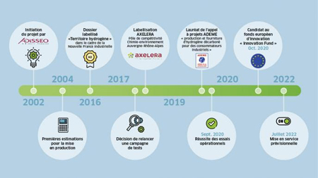 Après une première démarche portée en lien avec les partenaires locaux qui a fait l’objet du label « Territoire Hydrogène » dans le cadre de la Nouvelle France Industrielle en 2016, le projet a également été retenu par le Programme d’investissements d’avenir opéré par l’ADEME dans le cadre de l’appel à projets « production et fourniture d’hydrogène décarboné pour des consommateurs industriels ». Le pôle de compétitivité Chimie-Environnement AXELERA affirme également son soutien à cette initiative et l’a labellisée projet majeur.