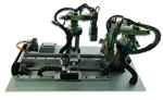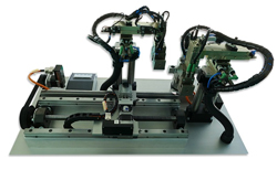 Dans cette application, l’automate de manutention est commandé par un moteur pas à pas et utilise un entraînement par courroie dentée en combinaison avec une vis à billes pour le convoyage de composants sur l’axe horizontal. norelem a dévelopé cette application pour montrer le transfert le long d’un axe vertical , c’est pourquoi une table de positionnement circulaire a été choisie pour l’alimentation en pièces sur les deux axes.