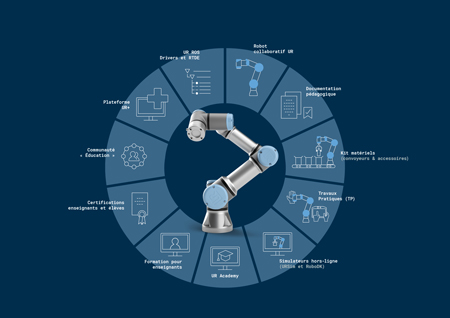 Pour ce faire, les enseignants bénéficient de 4 jours de formation complète identique à celle proposée aux clients, partenaires et intégrateurs d’Universal Robots afin de maîtriser à la fois la cobotique telle qu’elle est déployée et utilisée dans les environnements industriels réels mais aussi la méthode pédagogique d’Universal Robots.