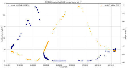 Image 1 : L’image montre l’humidité relative (en bleu) et la température (en jaune), mesurées par l’instrument de mesure de l’humidité MEDA HS pendant un jour martien (connu sous le nom de sol). Pendant la journée, l’humidité relative est proche de zéro pour cent, mais elle augmente la nuit, à mesure que la température baisse.