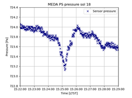 Image 2 : Les tourbillons de poussière observés par l’instrument de mesure de la pression MEDA PS apparaissent dans les mesures comme une baisse rapide et brutale de la pression.