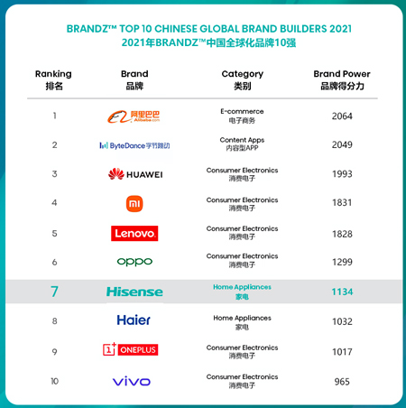 Elle figure également en 8ème position du classement des 20 plus grandes étoiles montantes de l’année, le “BransZ TOP20 Chinese Brand Stars 2021“, qui a été inclus dans le rapport pour la première fois cette année. Hisense prouve une nouvelle fois sa place de leader sur l’industrie de l’électronique grand public et de l’électroménager via ses deux classements.