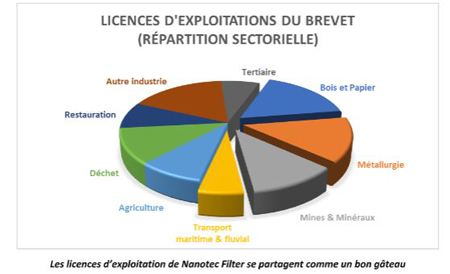 Pour commercialiser sa technologie, Nanotec Filter offre à ses partenaires la possibilité de prendre le contrôle de son marché en se plaçant sur son secteur d’application et d’en obtenir la licence exclusive. Parmi ces secteurs, on retrouve notamment l’industrie minière, l’industrie du métal, l’industrie du transport maritime et l’industrie du bois. Cette approche est à elle-seule une stratégie « classique » de commercialisation de brevet, mais ce n’est pas tout…