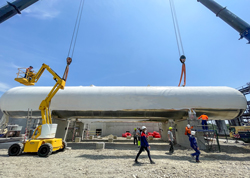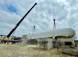 Débuté en mars 2021, le chantier a franchi une nouvelle étape le 2 juillet dernier avec l’arrivée de deux cuves aux dimensions hors-normes. Longues de 29 mètres pour un poids à vide de 53 tonnes, elles permettront de stocker chacune 270 tonnes de CO2 liquide sur place, offrant ainsi une plus grande flexibilité au niveau de la production et de la distribution. Organisé de nuit pour gêner au minimum la circulation, le convoi exceptionnel aura mis presque 2 jours à une vitesse de 10 km/heure pour acheminer les réservoirs du port de Bayonne au site de Vertex Bioenergy situé sur la plateforme Induslacq.