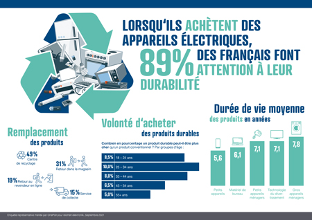La majorité des Français déclarent qu’ils remplacent leurs appareils principalement lorsqu’ils sont cassés et/ou perdus (63%) même si 12% les remplacent au profit d’appareils ayant une meilleure efficacité énergétique. La durée de vie des différents appareils dépend largement de la catégorie de produit : les gros appareils tels que les machines à laver ou les réfrigérateurs ont l’espérance de vie moyenne la plus élevée dans un ménage français, ils sont utilisés pendant un peu moins de huit ans avant d’être remplacés. Les petits appareils, comme les smartphones, sont utilisés pendant environ de 5 ans et six mois.