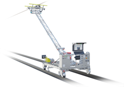 Le système CM4 est composé d’un châssis surmonté d’un bras qui vient apposer la tête de mesure au plus près du caténaire et des fils de contacts. L’analyse s’opère au rythme de l’avancement automatique du chariot.