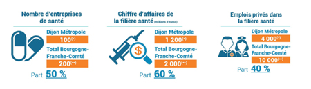 Les acteurs industriels affichent une croissance soutenue en termes d’emplois, de chiffre d’affaires et du nombre d’entreprises, avec une forte représentation dans le bassin d’emplois de Dijon Métropole (chiffres 2019). Le tissu industriel du bassin de Dijon Métropole est réparti autour de 3 univers métiers que sont la Chimie fine/pharma/santé et bien-être, les technologies médicales (dispositifs médicaux, équipements de santé, e-santé, etc.) et les Sociétés de Services et d’Innovation pour les Sciences de la Vie (CRO, prestataires de services, etc.).