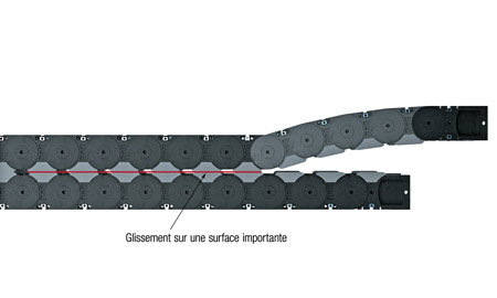 Si la longueur autoportante des chaînes porte-câbles est dépassée, elles sont généralement utilisées sur un modèle de glissement superposé, ce qui réduit généralement la hauteur du raccord au point mobile. Afin de réduire la longueur de la boucle de la chaîne, on utilise un raccord au point mobile dit pivotant ou oscillant. Un affaissement de la chaîne après le point mobile, qui conduit à un contact ponctuel en est cependant le résultat. C’est là que l’usure maximale apparaît et réduit sensiblement la durée de vie du système en raison de la charge ponctuelle dans cette zone.