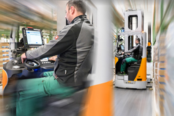 Lors des prises de palettes, un nouveau système de guidage laser à faisceaux croisés permet de positionner plus facilement et plus rapidement les fourches, à la bonne hauteur et au milieu de la palette. Une caméra montée à l’intérieur de la fourche envoie en permanence des images vers l’écran de bord, offrant au conducteur une vue optimale sur chaque prise et dépose de charge. Grâce à ces dispositifs, combinés à la stabilisation active du système de levage, les dommages liés aux collisions, les marchandises cassées et les blessures corporelles dues aux chutes de charges sont évités avec une grande efficacité, même à grande hauteur. Un laser de position installable en option sur le mât peut également assister efficacement le déplacement horizontal du chariot vers le point de stockage souhaité dans le rayonnage. Dès que le pointeur laser illumine le marquage correspondant sur le rayonnage, le magasinier sait que l’emplacement de prise/dépose correct est atteint. Il lui suffit alors de s’aider de la caméra montée sur la fourche pour atteindre la hauteur souhaitée sans avoir à se contorsionner.