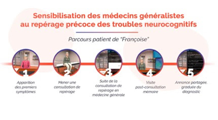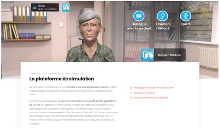 Cette solution a été co-construite avec des médecins spécialistes (neurologues, gériatre) et généralistes et est soutenue par France Alzheimer et la Société française de Gériatrie et de Gérontologie. Il s’agit du premier simulateur numérique destiné à sensibiliser les médecins généralistes au repérage des troubles neurocognitifs, notamment ceux liés à la maladie d’Alzheimer, face à une plainte ou une situation à risque, dans le but de favoriser une prise en charge globale rapide et le maintien le plus longtemps possible de la qualité de vie du patient.