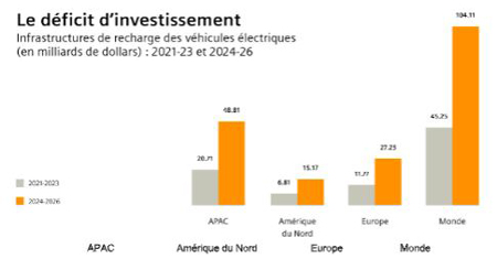 L’étude divise le déficit d’investissement en deux périodes, d’abord les années 2021-2023, puis 2024-2026, afin de faire la distinction entre la croissance générée par les précurseurs et celle résultant de l’adoption générale plus tardive des VE par les concurrents « suiveurs ». La forte augmentation entre ces deux périodes montre que le défi d’investissement croît à un rythme exponentiel.