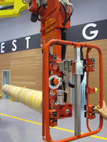 Le manipulateur est équipé d’un outil de préhension à expansion pneumatique qui assure une excellente prise par le mandrin carton de la bobine. Celui-ci est équipé en l’occurrence d’un moteur pneumatique qui va permettre de faire tourner en continu la bobine autour de son axe horizontal.