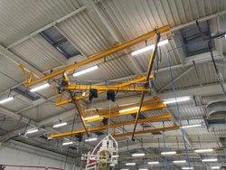 Simultanément, pour un autre bâtiment de l’annexe, Manelec a fourni un pont roulant de 6,3 tonnes et de 28 m de portée, avec une structure autoporteuse. Il est utilisé pour des modifications spéciales sur des tracteurs. Le pont est équipé d’un palan électrique à câble EUROBLOC VT2 de VERLINDE. Il est doté d’un moteur de direction à vitesse variable de 3 à 20 m/mn. L’installation de ce pont a nécessité au préalable une modification des fondations avec puit de consolidation de 32 mètres.