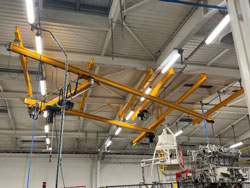 L’installation s’est faite au-dessus de machines existantes, elle a mobilisé l’expérience et le savoir-faire de Manelec pour la manipulation précise et sécurisée des structures. Manelec a utilisé des palans manuels pour l’élévation des poutres et nacelles.
