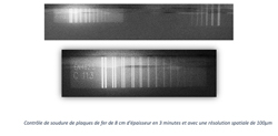 Les informations spectrales récoltées sur les matériaux par les caméras X-Ray WIDEPIX - MPX3 seront d’ailleurs utilisées à la fois pour discriminer différents matériaux, pour identifier les matériaux d’intérêt, ou pour calculer leur quantité dans l’échantillon. Pour exemple (cf image 2), les caméras X-Ray WIDEPIX - MPX3 permettent le contrôle de soudure de plaques de fer de 8 cm d’épaisseur en 3 minutes et avec une résolution spatiale de 100µm.
