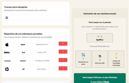Comment ça marche ? Le simulateur a été construit de manière très simple : le chef d’entreprise ou le responsable RSE de la société indique la répartition de la flotte informatique de l’entreprise par marque et par typologie de produits (nombre d’ordinateurs portables, de smartphones et de tablettes).