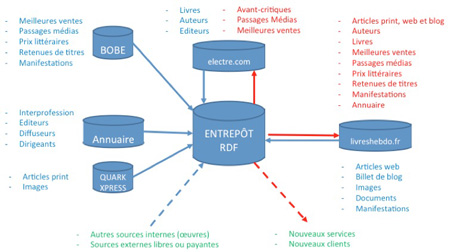 ELECTRE s’est trouvée confrontée à un double enjeu. Le premier portait sur l’interopérabilité des données, avec l’objectif d’ouvrir les données internes en décloisonnant les silos de données existants et de capter des données externes, notamment en moissonnant les contenus et données ouvertes de Wikipédia / DBpedia. Le second enjeu était d’urbaniser le système d’Information en créant un infocentre ou datawarehouse de nouvelle génération, sans toucher en quoi que ce soit aux applications métier et à leurs silos de données.