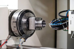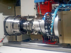 Le site de production historique de WTO abrite plus de 50 machines à commande numérique. Le serrage sur ces machines s’effectue principalement à l’aide de mandrins à mors, et le changement et l’alignement pour chaque OP se font manuellement. Le premier procédé de fabrication entièrement sans personnel mis en œuvre dans l’usine intelligente portait sur la production d’un boîtier, avec un tournage avant et après traitement thermique. Sascha Tschiggfrei poursuit : « Toutes les machines de l’usine intelligente sont nouvelles. Ce sont des modèles standard qui ont été spécialement adaptés pour permettre le changement automatique des dispositifs de serrage à l’aide d’un robot. » HAINBUCH devait équiper quatre machines : deux centres de tournage/fraisage dans une cellule avec serrage intérieur sur la contre-broche, et deux rectifieuses cylindriques dans une autre cellule, l’une avec serrage extérieur et l’autre avec serrage intérieur. Pour le serrage extérieur en vue de la rectification, HAINBUCH disposait déjà d’un mandrin standard, le TOPlus AC 100 à placage axial. Pour les différents boîtiers, 18 jeux de serrage sont désormais disponibles. Ils se composent d’une tête de serrage avec butée d’arrêt, qui est changée automatiquement sur le mandrin. En revanche, pour le serrage intérieur lors du tournage et de la rectification, un nouveau concept était nécessaire. Celui-ci reposait sur le mandrin MAXXOS T211 existant, mais pour intégrer les contrôles de sécurité, une version spéciale devait être mise au point.
