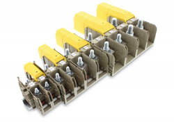 Les borniers HSKG peuvent être installés sur des rails DIN TS 35 standard, conformes à la norme EN 60715. Ils sont adaptés aux courants nominaux compris entre 125 et 520 A, sous une tension nominale maximale de 1 000 V. Selon la section de câbles, ils sont équipés de boulons M6, M8, M10, M12 ou M16. Les conducteurs sont fixés sur les boulons avec des cosses serties, puis connectés en toute sécurité au jeu de barres à l’aide d’écrous hexagonaux. Deux cosses peuvent être connectées par boulon. L’association d’une rondelle monobloc et d’un contre-écrou hexagonal garantit une sécurité à toute épreuve grâce à la tension du ressort conique, à la force de contact, à la résistance aux vibrations et aux connexions sans entretien, éliminant ainsi le resserrage. La sécurité optimale est assurée par la faible chute de tension et par l’utilisation d’une matière autoextinguible dotée d’un indice d’inflammabilité V0 (UL94). La distribution est possible à l’aide de pontages 2 et 3 pôles. CONTA-CLIP fournit également des accessoires qui facilitent l’installation et renforcent la sécurité, comme les capots à charnière ADH qui offrent une protection contre les contacts, y compris lors de l’insertion d’une sonde de test, ainsi que des couleurs variables qui facilitent l’identification. Le capot ADH est facile à installer : il se fixe aux parois du bornier lors de sa fermeture. Les butées d’arrêt ES 35/K/ST serrent de chaque côté du rail DIN à l’aide de brides en acier, et garantissent ainsi le maintien du bornier. Pour une identification optimale des équipements, les borniers peuvent être étiquetés à l’aide du système de marquage PMC Pocket-Maxicard de CONTA-CLIP.
