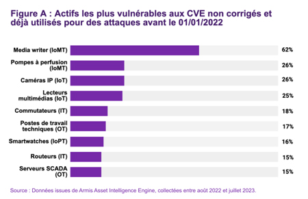 Les chercheurs d’Armis ont identifié un nombre important d’actifs connectés au réseau et pouvoir avoir des CVE non corrigées, publiées avant le 1er janvier 2022. En étudiant le pourcentage le plus élevé d’appareils de chaque type présentant ces CVE entre août 2022 et juillet 2023, Armis a élaboré la liste présentée dans la figure A. Non corrigés, ces actifs présentent un risque important pour l’entreprise.
