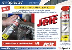 Développé par ITW Spraytec sous la marque JELT, LUBRITACK est un nouveau lubrifiant professionnel délivré en aérosol et destiné spécifiquement à la protection et à la lubrification longue durée des équipements ayant des organes mécaniques ouverts.