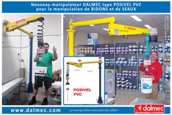 Ciblant notamment les secteurs industriels de l’agroalimentaire, de la cosmétologie, de la chimie et de la pharmacie, Dalmec présente un nouveau manipulateur industriel de type POSIVEL PVC fixe sur colonne, conçu et développé sur mesure pour la manutention, la prise, le déplacement de bidons et de seaux en sortie de ligne de fabrication et leur dépose sur palette ou chariot de transfert.
