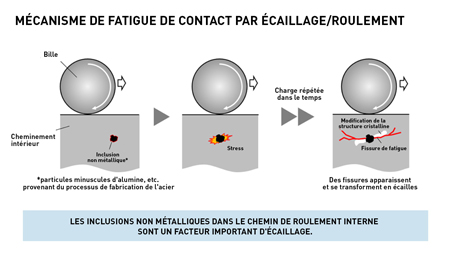 Les recherches de NSK ont démontré que, dans des conditions de bonne lubrification, la composition et la qualité (quantité d’impuretés) de l’acier du roulement constituent un indicateur plus précis pour prévoir la durée de vie d’un roulement. Cependant, au fur et à mesure des recherches, les ingénieurs se sont rendus compte qu’une méthode d’évaluation basée sur la mécanique de la rupture pourrait fournir des informations plus pertinentes.