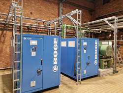 Comparaison directe : Le nouveau compresseur Turbo T 220 de BOGE est nettement plus petit qu’un compresseur à vis sans huile de même puissance. Par exemple, la surface d’installation est deux fois plus petite et le poids réduit de deux tiers. Cette réduction de l’encombrement est notamment possible grâce aux arbres d’entraînement sur palier pneumatique et aux moteurs puissants dans un processus de compression sophistiqué. Le nouveau compresseur Turbo est très efficace énergétiquement et produit un débit d’air de 35,6 m³/min à une pression de 7,5 bar. L’efficacité énergétique et les faibles coûts ont également convaincu le Groupe Barry Callebaut d’utiliser les nouveaux compresseurs Turbo. Grâce à la série T, le chocolatier suisse économise des milliers d’euros par an sur les coûts d’énergie et de maintenance.