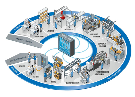 La réalisation d’armoires se situe dans un champ de tension remarquable : un nombre presque ingérable de caractéristiques : techniques face à l’évolution rapide des exigences des clients, la pression des coûts et des prix avec des délais serrés. Cela ne peut réussir que si les possibilités offertes par l’automatisation et la numérisation sont adoptées pour créer une interaction parfaite entre le produit, le process et les équipements de production. À l’heure actuelle, il n’existe pas de solutions cohérentes et économiques qui répondent aux besoins individuels du constructeur d’armoires de commande.