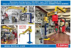 Toujours en quête d’innovation, et conformément à ses engagements dans la lutte contre les TMS, Dalmec présente une nouvelle version de son manipulateur type PARTNER EQUO développée en exécution sur colonne désaxée pour permettre des opérations aisées de manipulations d’arbres porte-bobines de diamètres, de poids et de dimensions variables.