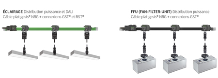 Le système de câbles plats simplifie l’installation et la planification et garantit non seulement la simple distribution d’énergie, mais permet également la distribution combinée et décentralisée d’énergie et de données (KNX, SMI, DALI, …) dans les bâtiments fonctionnels.