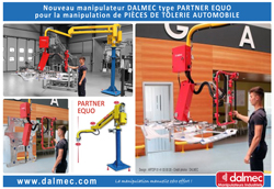Ainsi, dans le cadre du développement de ses solutions adaptées à ce secteur, Dalmec est heureuse de présenter un nouveau manipulateur industriel de type Partner Equo conçu sur-mesure pour assurer la prise, le déplacement, le positionnement ou la dépose de pièces de tôlerie automobile.