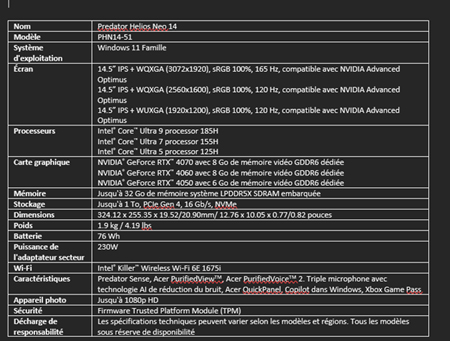 Acer dévoile ce jour le dernier-né de sa marque gaming haut de gamme : Predator Helios Neo 14. Un véritable concentré de puissance mobile, il est équipé du dernier processeur Intel® Core™ Ultra, débloquant l’expérience IA sur PC. En parallèle le PC portable gaming Acer Nitro 16 a reçu des mises à jour en intégrant le processeur Intel Core de 14ème génération, offrant aux utilisateurs davantage de possibilités en matière de gaming ou de création. Les gamers de tous niveaux pourront profiter de visuels irréprochables et de graphismes pilotés par l’IA lors de leurs parties ou en streaming grâce aux GPU NVIDIA® GeForce RTX™ 40 Series pour ordinateurs portables, qui prennent en charge la dernière technologie DLSS 3.5 alimentée par l’IA ainsi que d’autres technologies pilotées par l’IA dans les applications créatives. Les couleurs s’affichent parfaitement sur les différentes options d’écrans WQXGA, associées à une prise en charge à 100 % de la gamme de couleurs sRGB et de la compatibilité NVIDIA G-SYNC®.