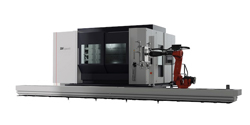 Bien entendu, il ne s’agit pas de manipuler manuellement ces gigas-pièces. La gamme space3 peut être automatisée pour le chargement/déchargement des pièces avec un robot 6 ou 7 axes monté sur rail au sol. Dans un contexte de temps de cycles longs, le robot alimente plusieurs machines afin de privilégier le travail en temps masqué.