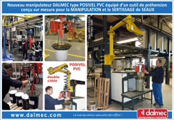 Dalmec annonce la sortie d’un nouveau manipulateur industriel de type POSIVEL PVC sur colonne, conçu et développé sur mesure pour la manutention, la prise, le déplacement de seaux et le sertissage du couvercle en sortie de ligne de fabrication et de conditionnement pour dépose au final sur palette..