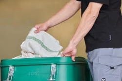 Après leur utilisation, les lavettes sont collectées dans des conteneurs spécialement prévus à cet effet. Les agents de service Mewa viennent ensuite les collecter selon un planning défini en amont. Les lavettes souillées sont considérées comme des matières dangereuses en raison des lubrifiants, des graisses et des peintures qu’elles ont absorbées. Le conteneur de sécurité hermétique « SaCon » sert à les stocker et à les transporter en toute sécurité et conformément à la législation en vigueur. Ce transport centralisé soulage les entreprises et minimise leur empreinte écologique.